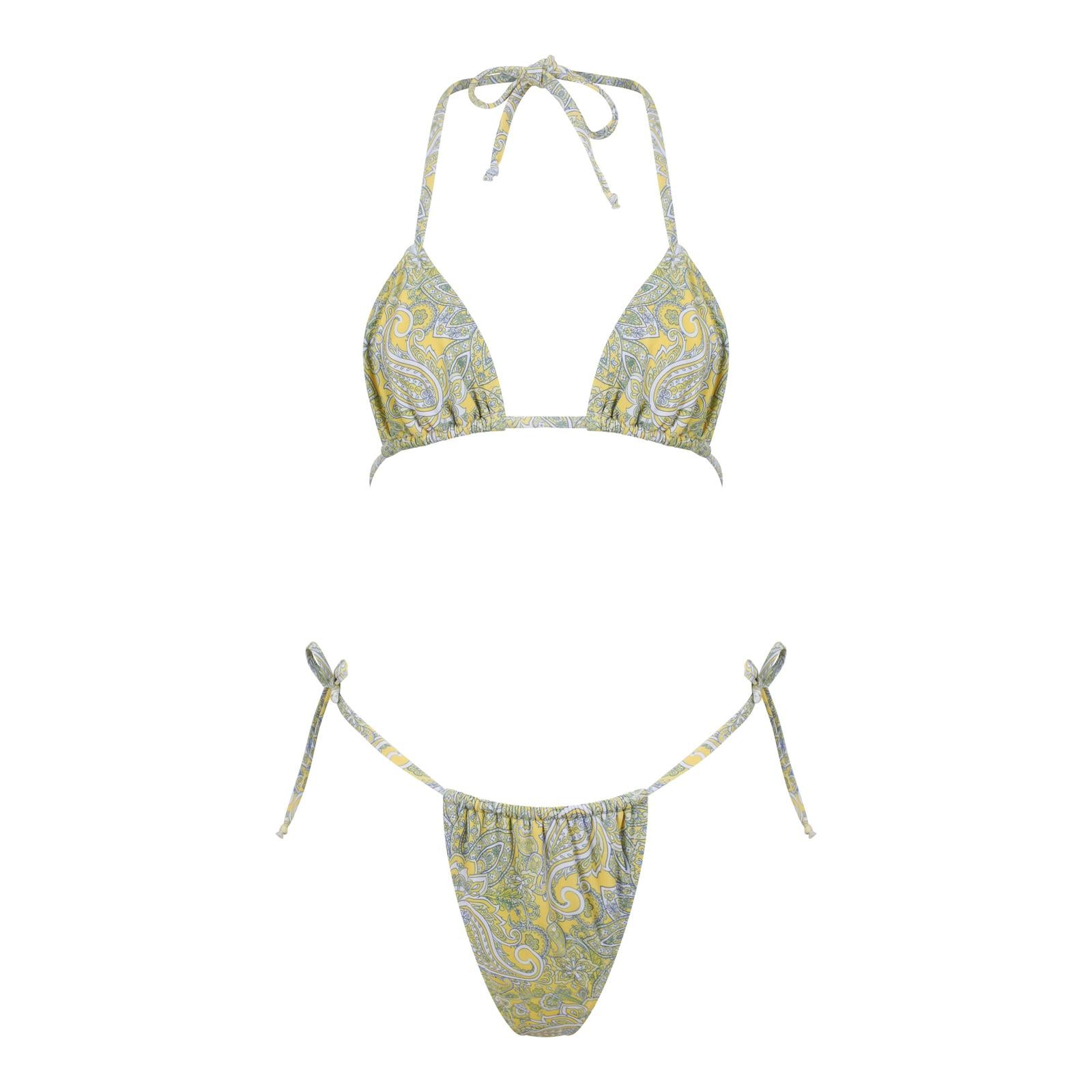 ביקיני על-זמני שני חלקים בגזרה קלאסית, חזיית משולשים עם קשירה מלאה, ותחתון מתכוונן להתאמה אישית לרמת הכיסוי הרצויה.